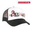 This white baseball cap is in a trucker style with a meshed back and a Quiksilver print on the