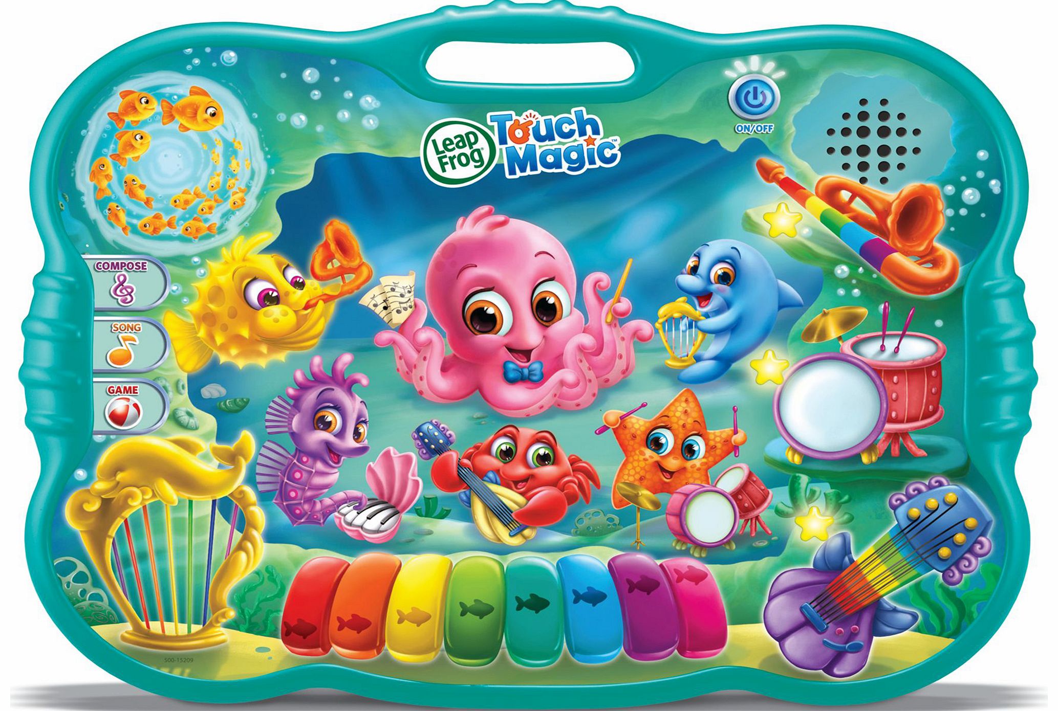 Join the Touch Magic Ocean Music School. Choose an instrument to play, layer it over your favourite beat and learn about music with help from five ocean friends including Octopus and Starfish. Make learning discoveries with every tap, slide and touch. The light-up board even has a handle for easy portability around the house or on the go. Jam along in 3 learning modes: Compose, Play and Game. In Compose mode children can mix musical background loops and play along with band member instruments.