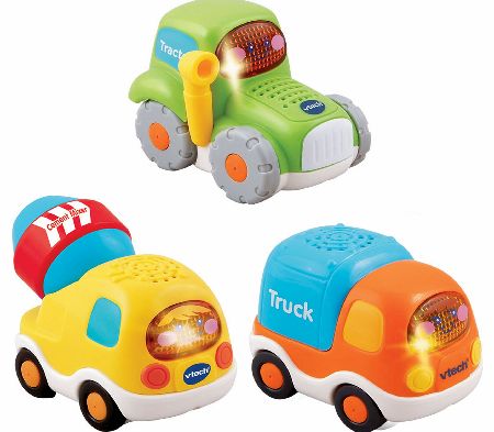 Lets get to work and zoom into learning fun with the Toot-Toot Drivers pack of Construction Vehicles. Pack includes the tractor, truck and cement mixer, each with their own fun phrases and realistic sound effects push the vehicles along and press the light-up screen button to trigger 3 sung songs and fun melodies. Encourages motor skill development and imaginative play, each vehicle also interacts with the Toot-Toot Drivers Garage for even more role-play fun. Requires 3 x AA batteries (includ