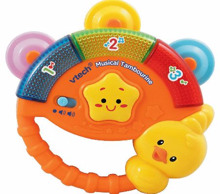 Shake to the beat! Learn 1-2-3 and hear fun tunes by pressing the big star shaped button and shaking the tambourine. The VTech Musical Tambourine features three colourful lights that flash along to the sounds and melodies, tambourine pieces that make shaking more entertaining and a cute birdie on the large, easy to grasp handle.Requires 2 x AAA batteries (included).