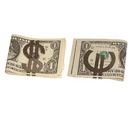 | Money, you can never have enough of it. Why not spruce up what you have got by carrying it in one of our money clips. With the Euro emblem on one side and the Dollar sign on the other, the money clip is sure to impress next time you get your wad out.......... Size: 60mm x 50 |