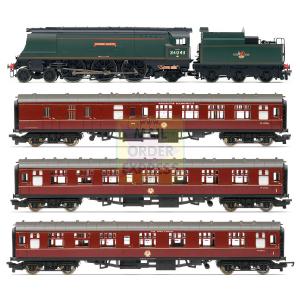 Officially named in 1927 the Pines Express was a passenger service which operated out of Manchester travelling South to Bournemouth During the journey the train would pick up and drop off coaches as well as change engines Set includes BR 4-6-2 West Country Class Combe Martin Skew Wound Motor Length 272mm 2 x BR Mk 1 Composite coaches Length 265mm and BR Mk 1 Brake Coach Length 265mm