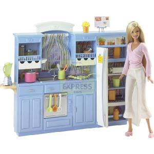 The kitchen playset has everything necessary for preparing a tasty meal or delicious snacks The refrigerator and oven doors open and include lots of play food pieces The sink and worktop have cupboards above and below and curtains on the window too Playset includes utensils and dishes One Barbie doll included