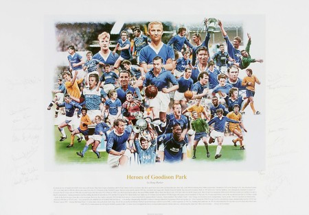 | This limited edition print has been produced from an original painting by Doug Harker to celebrate the history of Everton Football Club one of the most successful club s in English football history. The prints have been published to benefit The Everton Former Players Foundation. The first 300 in a limited edition of 2000 have been individually signed by 20 former players including Howard Kendall Graeme Sharp Drew Brand Ken Rea Tom E Jones Alec Farrell Harry Leyland Colin Harvey Dere |