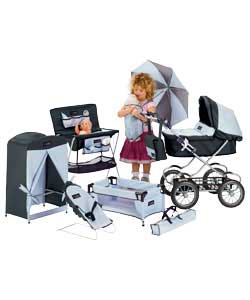 Only at Argos. Classic Pram: Adjustable handle height from 65 to 83cms. Traditional classic styled dolls; pram with tough folding sprung frame, large spoked wheels and handy shopping basket. Folds flat for easy storage. Fits dolls up to 50cms. For ages 5 to 11 years. Drink n; Wet Doll: Hard bodied 40cm doll. She drinks and wets just like a real baby. Sleeping eyes when its time for a nap. Convertible Changing Station: Multi-purpose, easy-to-assemble baby bathing and changing unit.Travel Cot: This easy to assemble travel cot includes a matching travel bag with shoulder strap to store your cot in. Size: (H)24, (W)30, (D)50cm.Changing Bag and Accessories: Changing Bag with roll out changing mat so you can change baby anywhere. 10 piece accessory set including feeding bottle, 2 nappies, hairbrush and mirror.Bouncer: With gentle bouncing action to soothe baby to sleepPapoose: Holds dolls up to 46cm so you can take baby everywhere you go!Wardrobe: Hang up babys outfits in this easy-to-assemble wardrobe with