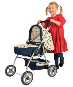 Features swinging chassis for a gentle rocking action, and easily adjustable seat unit for front/rear facing positions in pram and pushchair modes. Its got every option covered! Comfortable grip handle height 80cm, and under seat shopping basket. Suitable for dolls up to 50cm. Supplied in exclusive High Tea; fabric.For ages 4 years and over.
