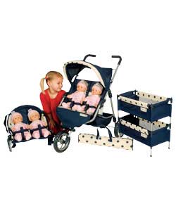 Its Twins! Sport Twin Stroller: handle height 80cm. Adjustable hood and super wide under seat shopping basket. Folds flat for easy storage. Twin Travel Cots: easy to assemble and include matching trav