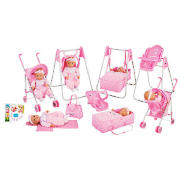 The My Little Baby doll playset features a travel system umbrella stroller with removable three-way rocking and feeding seat. The high chair converts to a swing, the carry cot converts to a swinging cradle and the travel bag converts to a changing pad. It holds dolls up to 46cm.