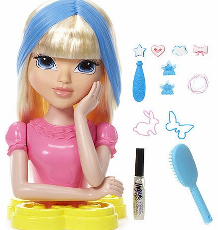 Style Moxie Girlz Avery in your own special way with her Magic Hair Stamp Designer Set. Use the special stamper to put eye-catching prints in her hair. You can also plait Averyandrsquo;s beautiful long locks or style them any way you like. Once youandrsquo;re happy with her look, add some glitter to give a sparkly finishing touch. Best of all, you can also use Averyandrsquo;s accessories on yourself. Shine like a Moxie Girl with this brilliant fashion set! This 4-in-1 styling head is great for M