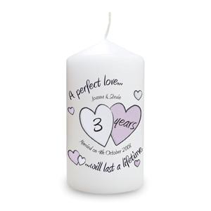 Celebrate with this lovely perfect love design keepsake candle which makes the ideal gift for any anniversary.Personalise with the couples names above the hearts upto 25 characters. The amount of years in the heart upto 2 characters and the date of marriage below the hearts upto 20 characters. The wording A perfect love...will last a lifetime and Married on is standard text.All candles come presented in gift wrap.