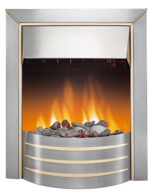 Inset fire that fits standard 16 inch and 18 inch fireplace openings, No chimney or flue required, Optiflame® Plus Effect, flame effect can be used independently of the heat, Heat Output: min 1kW, max 2kW, Heat Input: 2kW, Brushed stainless steel effect with brass effect inlays, Two detachable spacers allow the fire to be inset, semi inset or freestanding, We recommend that electrical fires are fitted by a qualified electrician, All fires must be installed in accordance with the manufacture