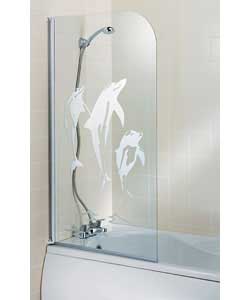 White half framed radius shower screen. Fits either end of the bath.90 degrees hinge movement for easy access and cleaning.Dolphin patterned 4mm toughened glass.Size (W)75, (H)137.5mm.