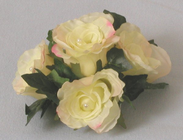 Rose Wedding Cake Topper. Another design in our Elegance range this pretty arrangement of silk rose buds with pearls and ivy sits on the top of the Wedding cake. We can prepare different sizes and can make enough to sit on each tier of the cake. Feel free to contact us about trailing ivy or a different colour rose. The cake topper shown here is approx.15cm diameter and 8cm high.