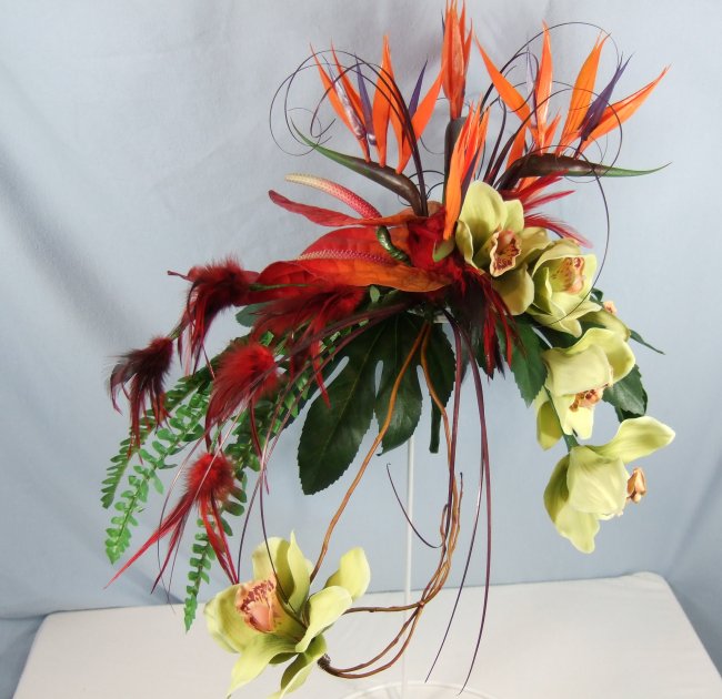 Tropical Bridal bouquet. Brightly coloured with silk flowers of Birds of Paradise anthurium orchids feathers and willow. Ideal for a wedding abroad.